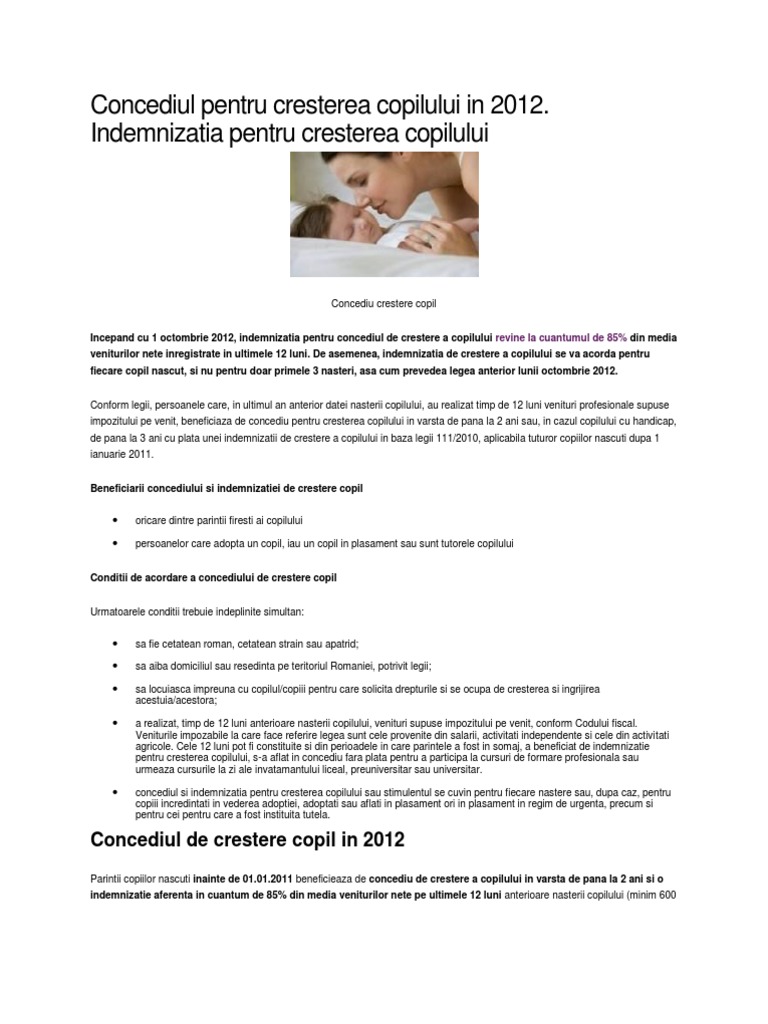 Pentru a beneficia in mod legal de concediul si indemnizatia de crestere a copilului, parintele interesat trebuie sa depuna o cerere, conform oug nr. Totul despre concediul de crestere şi îngrijire copil. Indemnizatia de crestere a copilului.