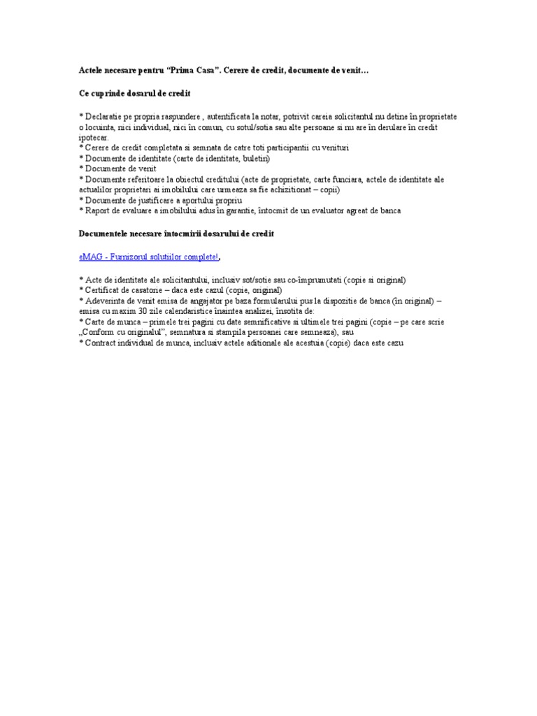 Pașii pentru obținerea unui cr. Acte necesare dosar prima casă. Pentru a obtine un credit prima casa, solicitantul trebuie sa prezinte o serie de documente valabile pentru fiecare banca ce acorda finantare prin programul prima casa.